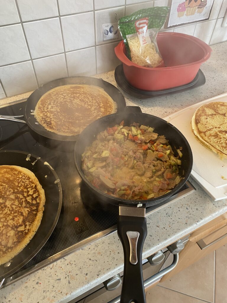 4-6 Palatschinken backen. Stelle dir aber folgende Fragen: Möchtest du nicht gleich mehr backen und Fritatten einfrieren? Soll es als Nachspeise eine Eispalatschinke geben? Möchtest du die Batwoman-Heldin-Mama sein und am nächsten Tag in die Schule eine mit Topfenkäse (oder Dip), Gemüse, Wurst + Käse gefüllte Palatschinkenrolle als Jause mitgeben? 😉 (à la gefüllter Wrap)