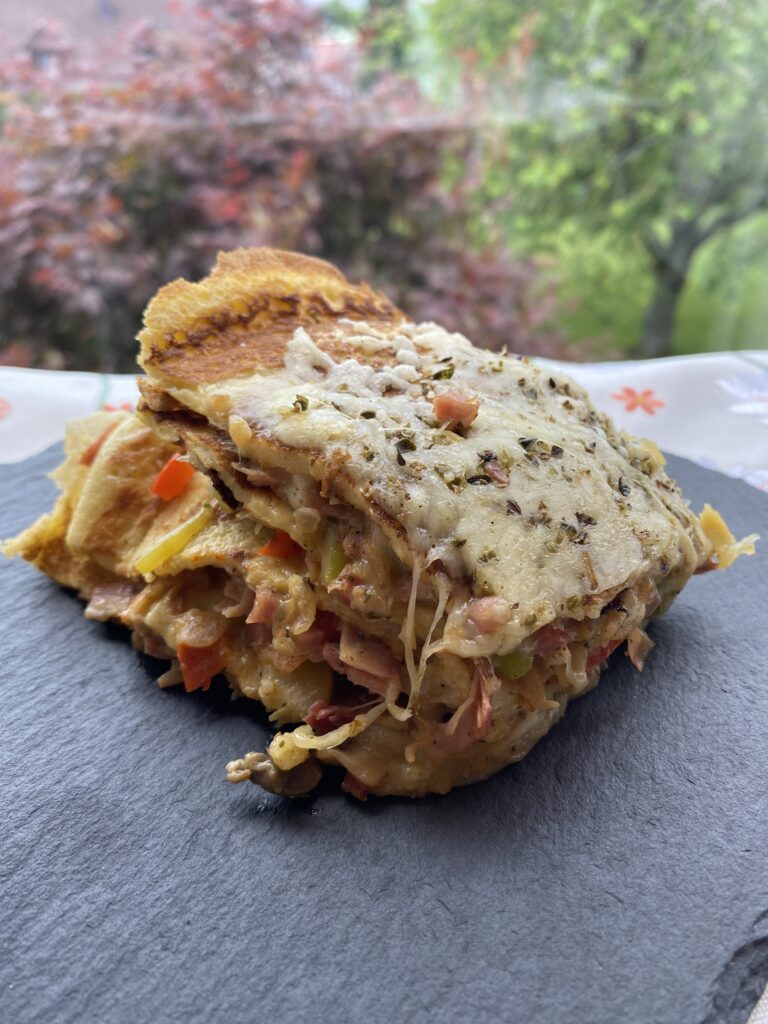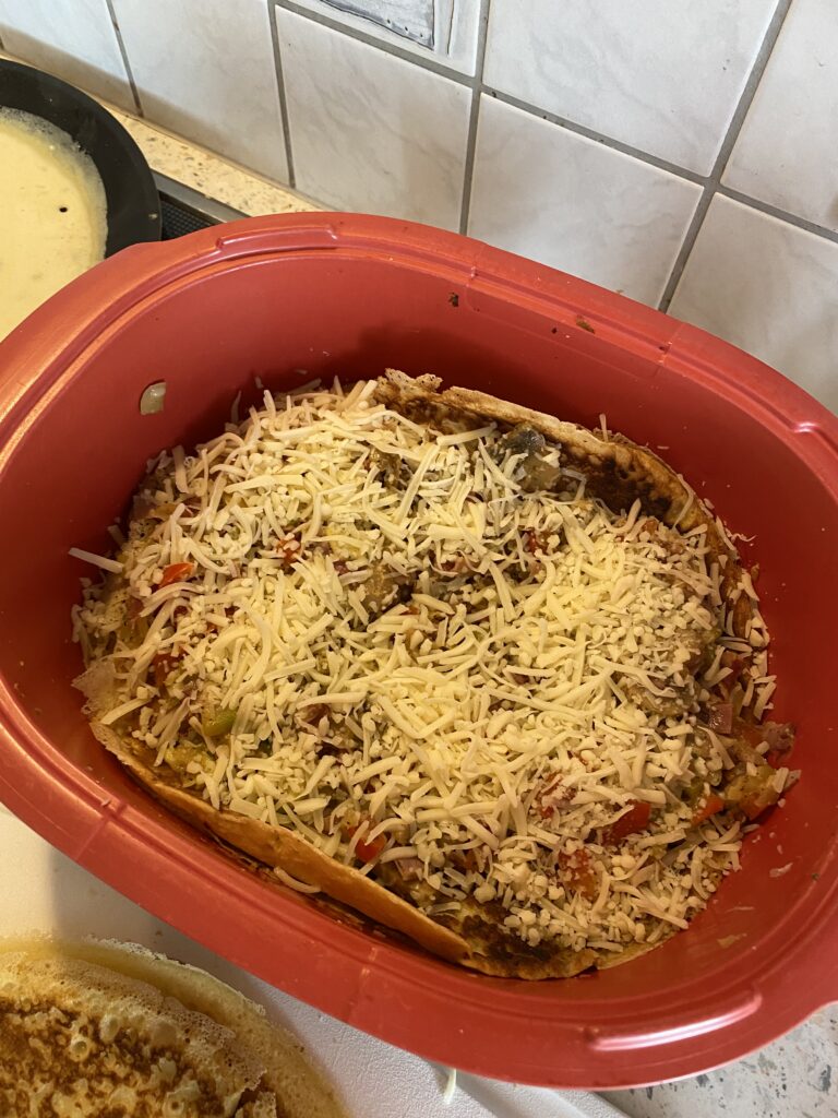 Die erste Palatschinke in eine Aufflaufform geben, einen Teil der Fülle darauf verteilen, ein bisschen Käse darüber streuen… den Vorgang so oft wiederholen, bis alles verschlichtet ist ;-).