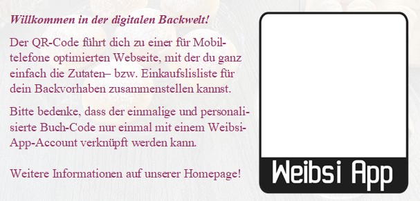 Zweiter Schritt: Scanne den QR-Code im Buch (du findest diesen auf der ersten Seite im Buch). Der eindeutige Buch-Code führt dich zu einer für Mobiltelefone optimierten Website, mit der du ganz einfach die Zutaten- bzw. Einkaufsliste für dein Backvorhaben zusammenstellen kannst. Der Code ist auch gleichzeitig dein ganz persönlicher Buch-Code, der die Funktionen der Weibsi App freischaltet. Ohne Buch ist die Nutzung der Weibsi App nicht möglich.