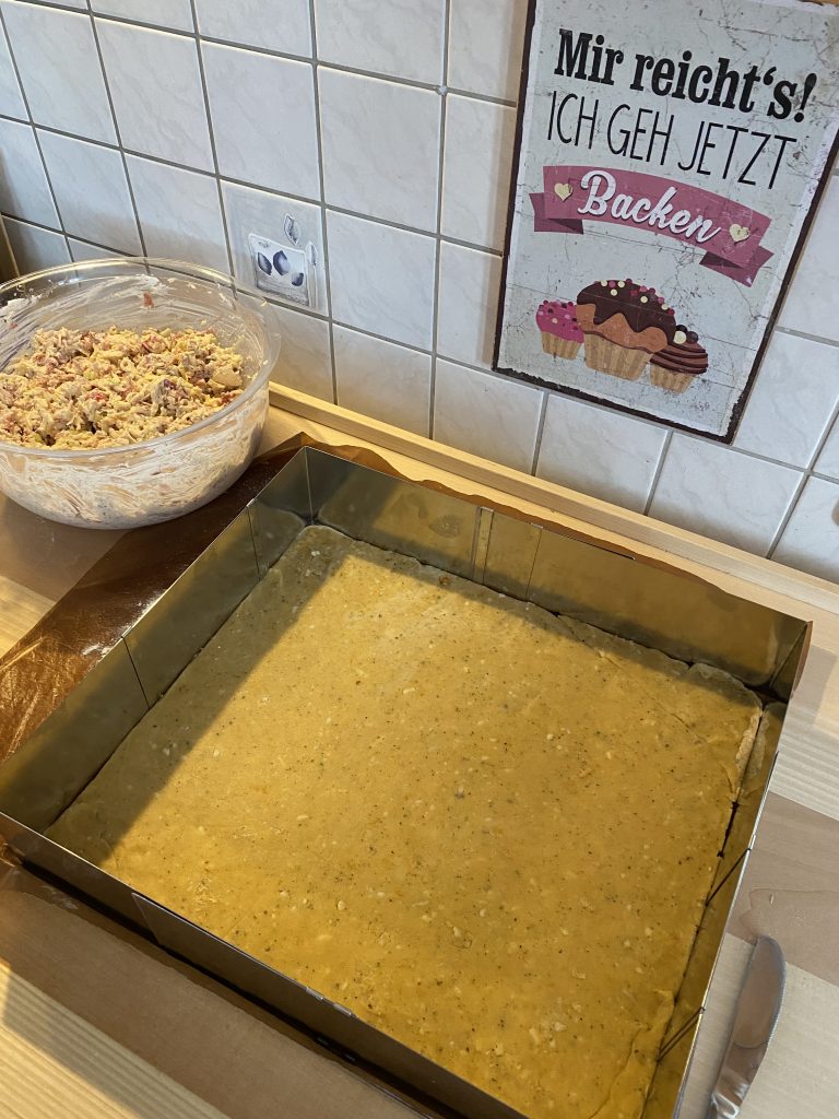 Zwei Drittel des Teiges als Boden auf das mit Backpapier ausgelegte Backblech (Backrahmen) auswalken.